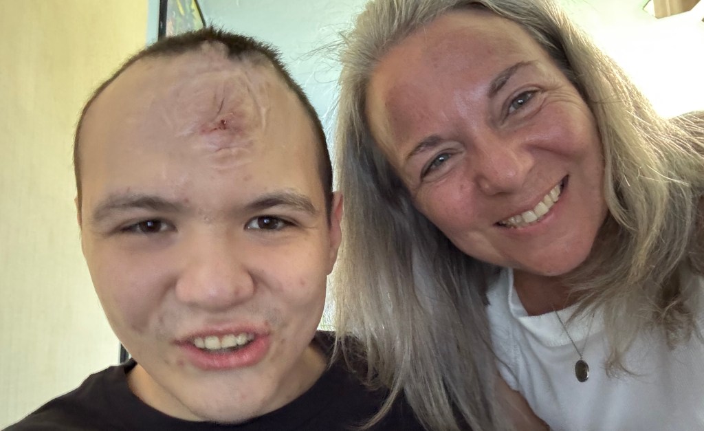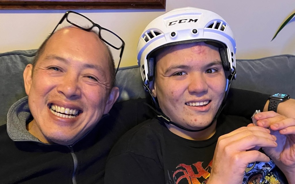 Wears a hockey helmet for protection from self-injurious behavior. Should be kept on at all times in an emergency, unless there is a head injury.